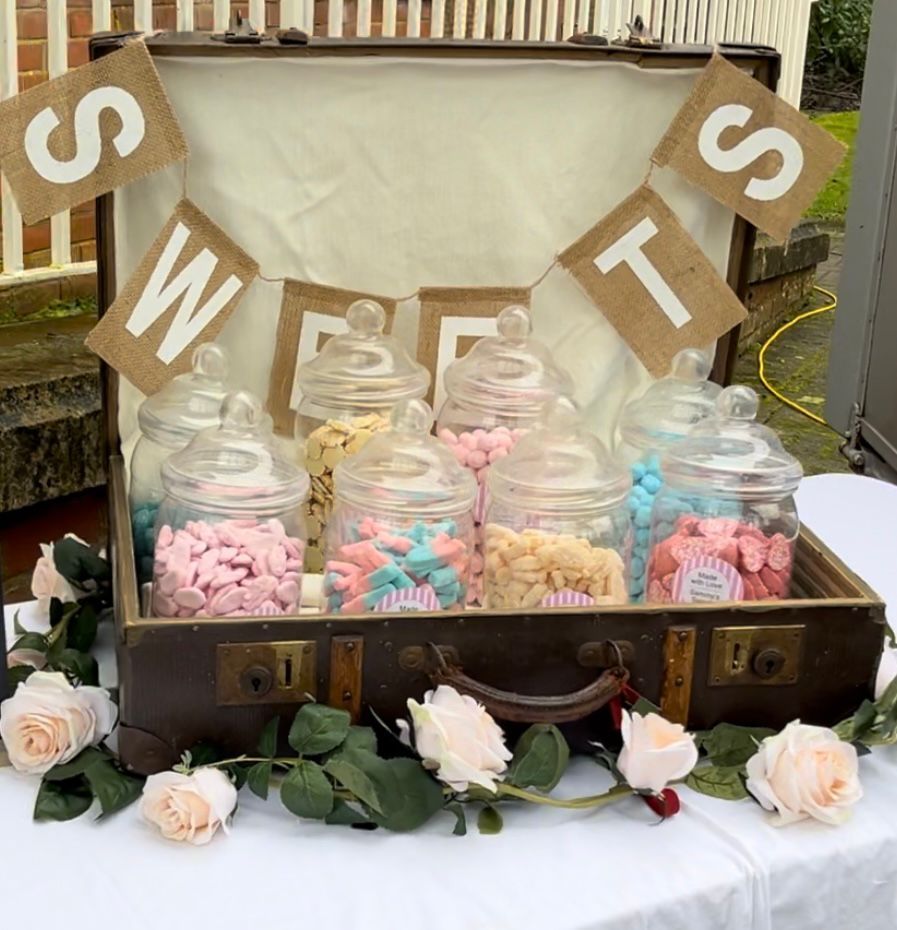Alternatively, from just £120, we can also offer a Sweet Table or Grazing Board, where your guests can help themselves, or we can theme our Apple Crates, Vintage Suitcases or Ladders for your celebration.